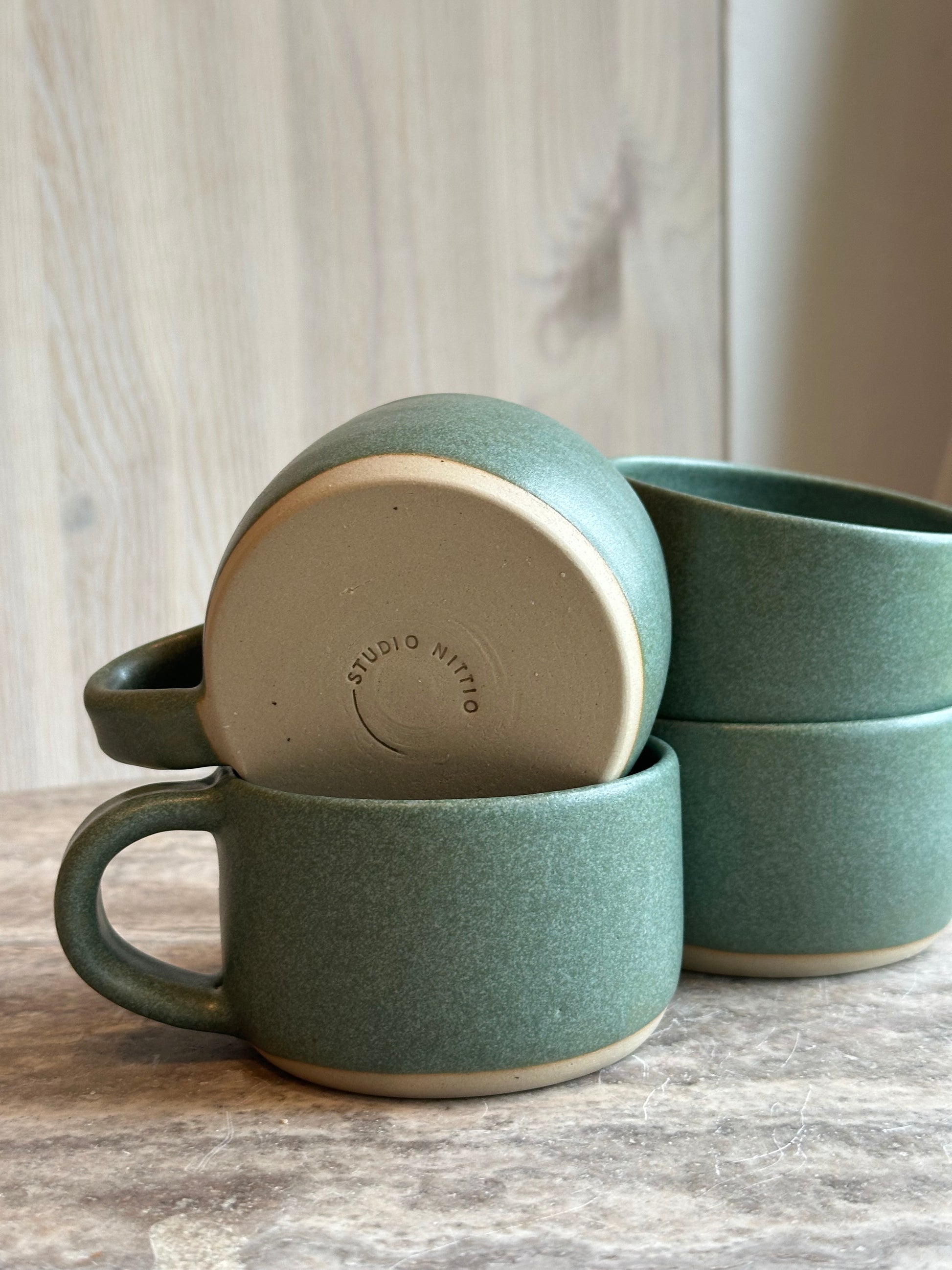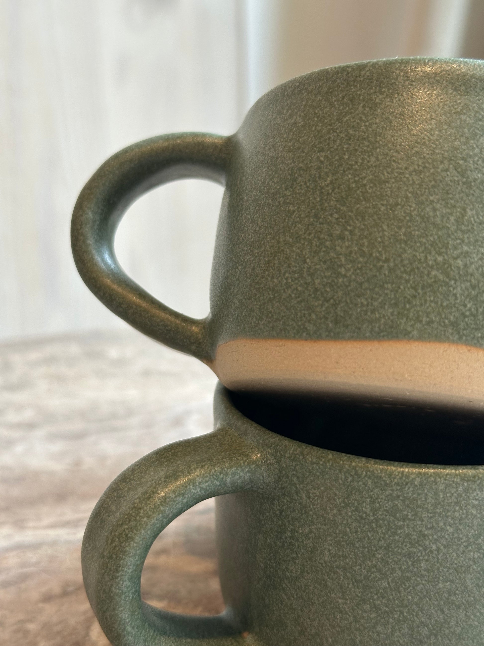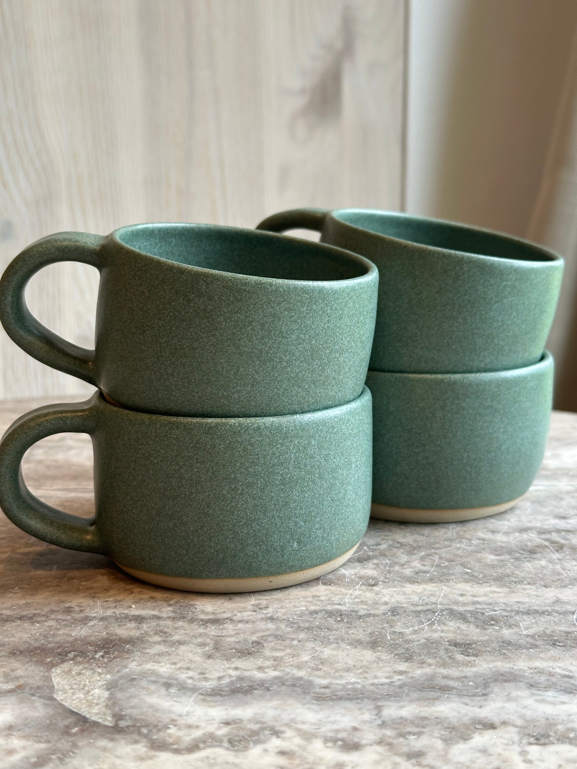 I grön glasyr med lite skiftningar. Halvmatt finish.