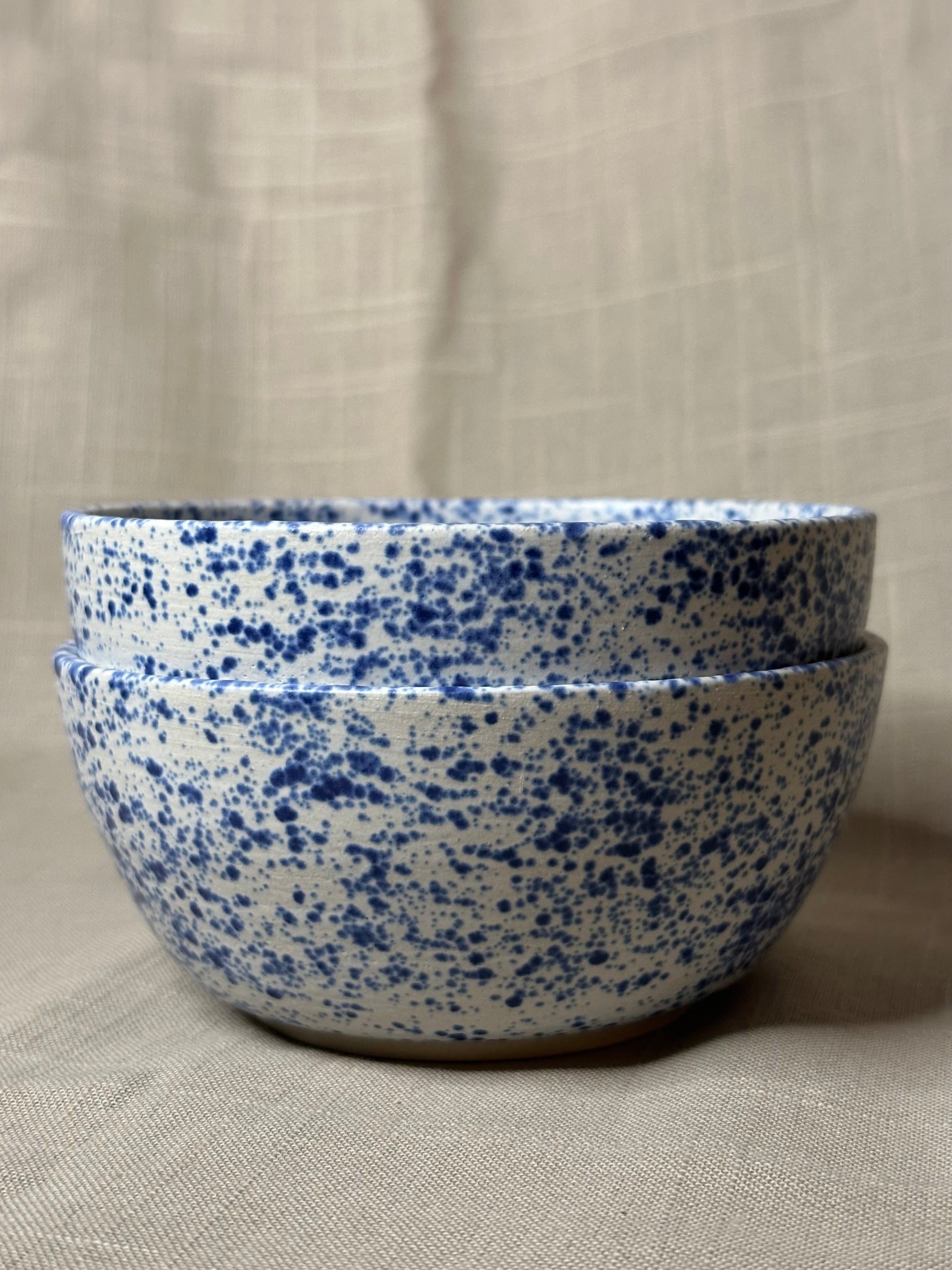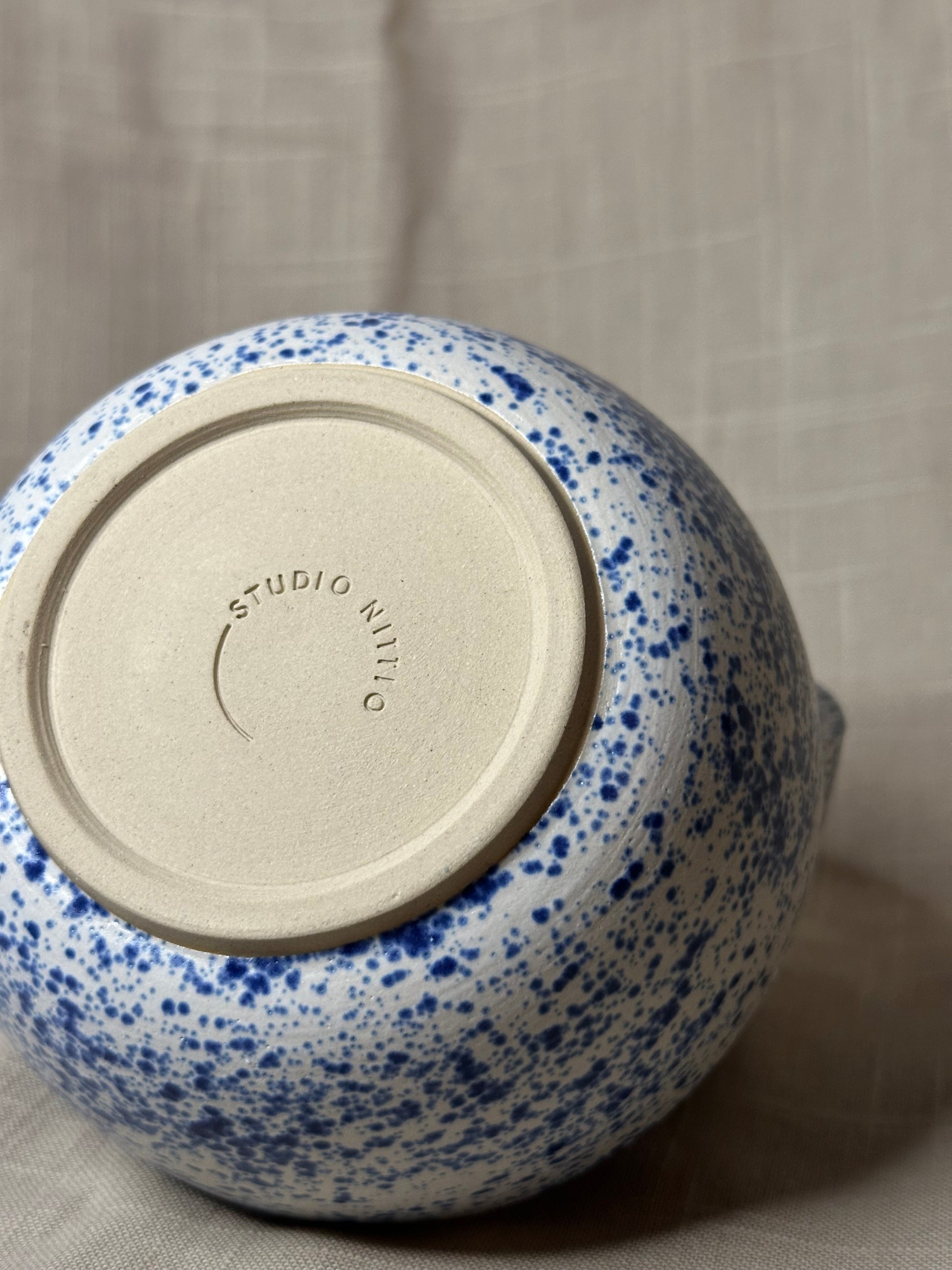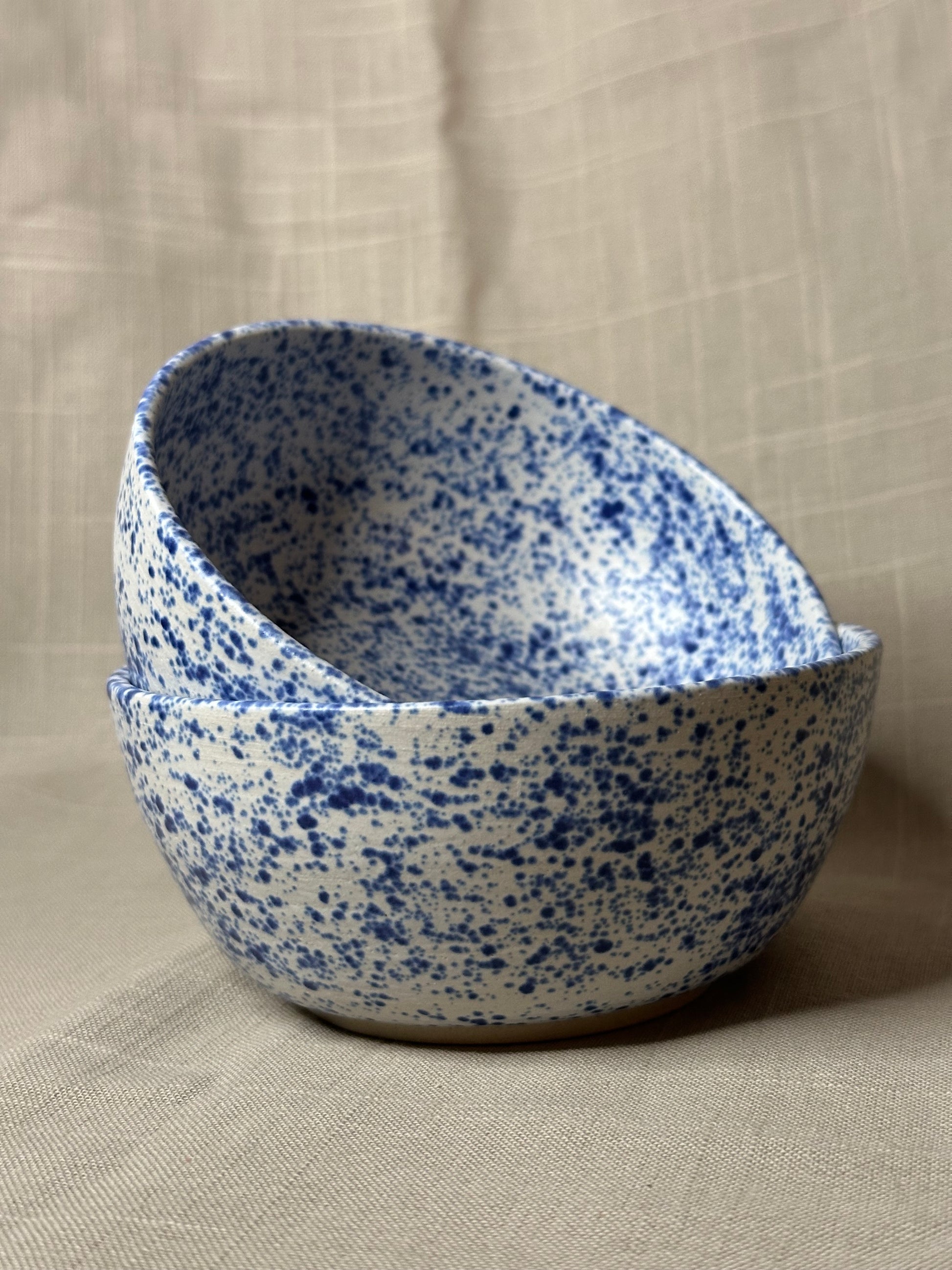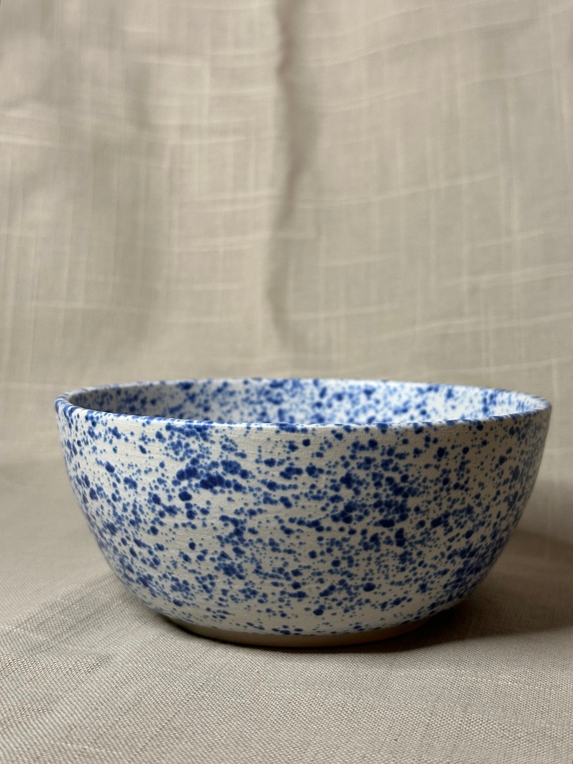 Vit- och blåprickig glasyr i silkesmatt finish.